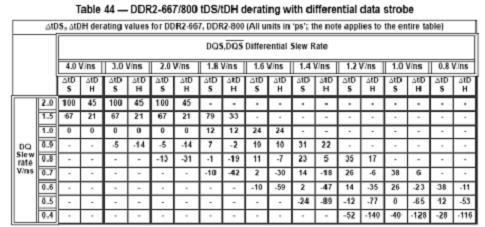 時(shí)序測(cè)試部分主要對(duì)DDR2數(shù)據(jù)、時(shí)鐘及控制線上各種時(shí)序進(jìn)行測(cè)量,包括數(shù)據(jù)輸入建立/保持時(shí)間、數(shù)據(jù)輸出保持時(shí)間、數(shù)據(jù)讀/寫時(shí)DQS前導(dǎo)/后續(xù)時(shí)間、時(shí)鐘半周期寬度、DQS輸入高/低脈沖寬度等等二十余項(xiàng)參數(shù)。其中,在對(duì)數(shù)據(jù)輸入建立/保持時(shí)間(tDS、tDH)進(jìn)行測(cè)量時(shí),JEDEC標(biāo)準(zhǔn)規(guī)定需要根據(jù)寫數(shù)據(jù)時(shí)的DQ及DQS信號(hào)斜率對(duì)測(cè)得的建立保持時(shí)間進(jìn)行修正。下表為JEDEC標(biāo)準(zhǔn)中對(duì)應(yīng)DDR2 667/800的輸入建立/保持時(shí)間修正參數(shù)表。例如,寫操作時(shí)當(dāng)DQ測(cè)得的斜率為1.5V/ns,DQS斜率為3.0V/ns時(shí),測(cè)得的DQ – DQS建立/保持時(shí)間需要加上67ps的修正值之后方能與標(biāo)準(zhǔn)中規(guī)定的最小建立/保持時(shí)間相比較。