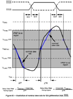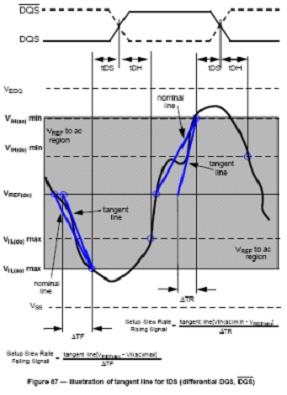 為了在上表中查到對(duì)應(yīng)的修正值,需要首先得出相應(yīng)信號(hào)的斜率。JEDEC標(biāo)準(zhǔn)規(guī)定了兩種斜率計(jì)算方法,即直連斜率norminal slew rate和切線斜率tangent slew rate,分別在不同數(shù)據(jù)波形時(shí)采納。兩種斜率計(jì)算方法如下圖所示。