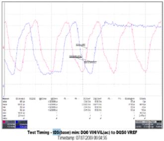 DDR2電氣性能測(cè)試部分主要測(cè)量各信號(hào)的直/交流邏輯高/低電平、信號(hào)過沖/下沖幅度及范圍、差分信號(hào)DQS及Clock輸入電壓及交叉點(diǎn)電壓、DQ及DQS輸出信號(hào)上升/下降沿斜率(SoutR、SoutF)最大/最小值、DQ,DQS及Clock輸入信號(hào)上升/下降沿斜率(SlewR、SlewF)最小值等等。