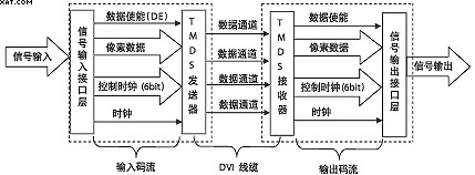 DVI是基于TMDS(TransitionMinimizedDifferentialSignaling,轉(zhuǎn)換最小差分信號)技術(shù)來傳輸數(shù)字信號,TMDS運(yùn)用先進(jìn)的編碼算法把8bit數(shù)據(jù)(R、G、B中的每路基色信號)通過最小轉(zhuǎn)換編碼為10bit數(shù)據(jù)(包含行場同步信息、時鐘信息、數(shù)據(jù)DE、糾錯等),經(jīng)過DC平衡后,采用差分信號傳輸數(shù)據(jù),它和LVDS、TTL相比有較好的電磁兼容性能,可以用低成本的專用電纜實(shí)現(xiàn)長距離、高質(zhì)量的數(shù)字信號傳輸。TMDS技術(shù)的連接傳輸結(jié)構(gòu)如圖1所示。