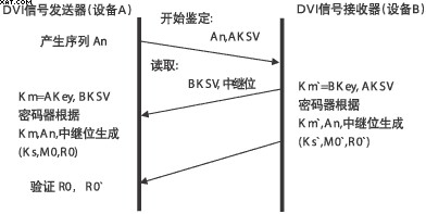 HDCP具體工作過程:首先由主機(jī)發(fā)送密鑰選擇導(dǎo)引序列(AKSV)和64bit偽隨機(jī)序列(An)到接收方,接收方回傳密鑰選擇導(dǎo)引序列(BKSV)和轉(zhuǎn)發(fā)器位(REPEAT-bit)(如是轉(zhuǎn)發(fā)器用以表示身份),發(fā)送方確認(rèn)BKSV是否已被廢除和是否包含20個1和20個0;如果雙方的設(shè)備密鑰和KSV有效,則計算產(chǎn)生一個56bit的公共密鑰Km和Km`,然后可產(chǎn)生KS、KS`(傳輸密鑰)、M0、MO`(64bit后續(xù)驗(yàn)證用追加初始序列)、RO、R0`(16bit指示驗(yàn)證成功,它必須在AKSV發(fā)送后100ms內(nèi)傳回發(fā)送方;驗(yàn)證成功后R01和R0相等;每128幀修正一次,每2s回傳一次)。因此當(dāng)DVI接口中斷傳輸2s以上,或是非授權(quán)設(shè)備接收時,主機(jī)將停止傳輸內(nèi)容,以達(dá)到保護(hù)傳輸內(nèi)容的目的。HDCP鑒定處理過程如圖6所示。