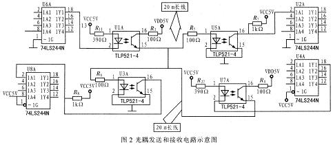 在長線傳輸中,正是因為地線的交流阻抗特性,使得地線成了電路中事實上的最大噪聲源。地線造成干擾的主要原因是地線存在阻抗,當電流流過地線時,會在地線上產生電壓,這就是地線噪聲。在這個電壓的驅動下,會產生地線環路電流,形成地環路干擾。南于發送和接收設備共用一段地線,會形成公共阻抗耦合。采用光電隔離器TLP521-4對發送和接收設備進行電氣隔離,對于減小交流阻抗的作用十分明顯,進而增大傳輸電流,有效地抑制地線噪聲;同時由于74LS244N的應用。總線驅動能力得到保障。圖2為光耦發送和接收電路示意圖。圖2中,上半部兩光耦自左向右傳輸信號,下半部兩光耦自右向左傳輸信號,左端74LS244N通過靜態存儲器IDT7132與處理器進行數據交換,右端通過8255與處理器進行數據交換。