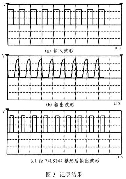 調試中,輸入周期為100μs,占空比為1/2的+5V方波,對一路光耦的輸入端波形和經過20m長線后接收光耦的輸出端波形以及經過74LS244整形后的波形進行記錄。記錄結果如圖3所示。