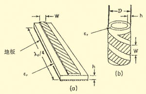 把一體化電視機視為一種計算機以后,只要把全方位螺旋微帶貼片天線直接插入數字電視機就能收看電視節目,在移動中接收數字電視,因為信號隨地理位置而變化,信道特性作動態變化,這就要求天線對不同信道的動態特性變化的穩定可靠性做出實時反映,在移動中天線需在全方位范圍內保持一定的帶寬和增益。為此我們設計出一種全方位圓柱體螺旋微帶貼片天線,它把1/4波長的微帶諧振器呈螺旋狀地繞在具有一定厚度(h)的空心圓柱體上,其微帶貼片與地板構成同軸圓柱體,體積比較小,可以和任何載體共形(例如汽車),同時也能設計成任何規格(例如:50Ω,75Ω)的帶線與同軸聯結器聯結,不需要匹配網絡,且空芯內部可以安裝有源電子器件。圖1就是1/4波長全方位微帶螺旋貼片天線的示意圖,(a)是1/4波長微帶諧振器,(b)是1/4波長全方位微帶螺旋貼片天線的示意圖。