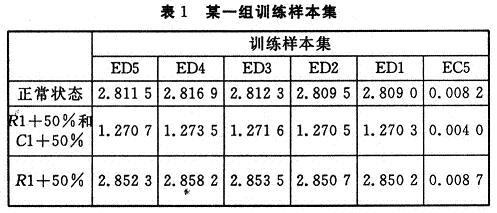 (1)構造特征向量,提取能量特征信息:在pspice中對電路的每一種狀態進行瞬時分析,取500個采樣點,并對每一種故障模式進行300次MonteCarlo分析,在Probe窗口中選擇菜單View\outputFile,或直接在Probe內選擇菜單File\Export將波形采樣數據存盤,可得到out節點的具體信息,將數據轉化為MATLAB數據文件,然后進行小波分析,在實驗中,經分析與比較,小波選擇db2小波,對每個故障信號進行5尺度小波分解。得能量特征信息F=(ED5,ED4,…,ED1,EC5)。這里可利用MATLAB中的sumsqr函數。從而得到網絡的訓練樣本集和測試樣本集。300次MonteCarlo分析,其中200次為訓練樣本,100次為測試樣本。
