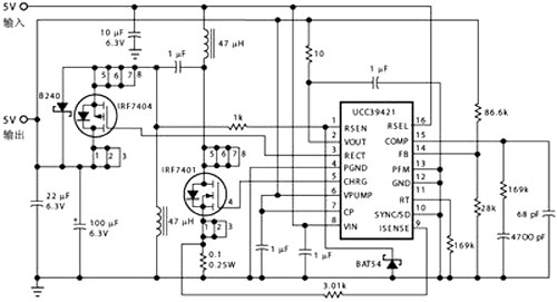 如果USB外設需要5V電源,事情就稍為有些棘手,因為USB口的外供電壓可能略高于也可能略低于這一數值。為此,以往常用先升壓再降壓或先降壓再升壓的辦法。這在需要多種輸出電壓的場合,倒也不失為一條可行途徑;但若僅需單一的5V輸出,此類電路結構便難免“疊床架屋”之嫌。或許正是這一緣故,上述之SEPIC盡管電路復雜,成本也高,但因其能集升壓、降壓功能于一身,所以近來已呈應用漸廣之勢。