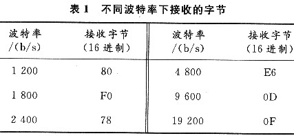檢測轉(zhuǎn)換裝置的串口波特率,首先可對主機(jī)的接收波特率(以9600b/s為例)進(jìn)行設(shè)定,并在終端發(fā)送一個特定的字符(以回車符為例),這樣,主機(jī)根據(jù)接收到的字符信息就可以確定轉(zhuǎn)換裝置的通信波特率。回車符的ASCII值是0DH,在不同波特率下接收到的值如表1所列。[page]