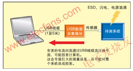 圖2:未隔離的USB數據采集模塊在ESD、閃電、電源浪涌的時候可能損害系統并導致數據不正確。