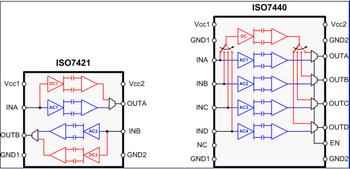 電容隔離的另外一個優(yōu)點(diǎn)是每個電容123毫微微法拉(123x10-15F)的超低容量,從而允許極高的數(shù)據(jù)速率傳輸并實(shí)現(xiàn)多通道隔離器的微電容幾何尺寸。