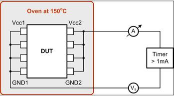 實(shí)際上,周圍溫度維持在150oC時,TDDB由隔離器的施加應(yīng)力電壓決定(請參見圖5)。測試之初便激活一個計(jì)時器,其在隔離器電流超出1mA時停止,表明電介質(zhì)擊穿。記錄每個測試電壓的故障時間,并根據(jù)理論E模型曲線進(jìn)行繪圖。