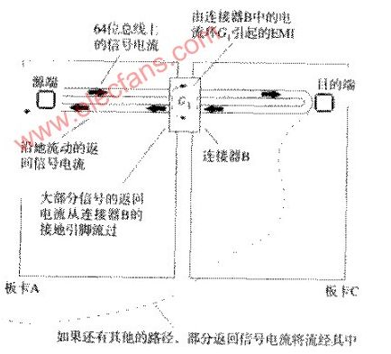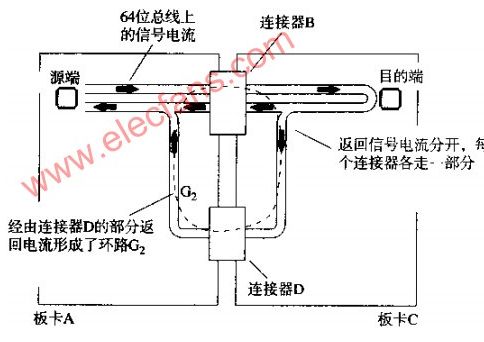 一個64位總線從板卡A經過連接器B連到母板卡上,母板卡可能是一個主CPU卡或是一個通往其他子卡的無源通道。64條信號線的返回電流從母板卡C流回板卡A,其中的絕大部分通過了連接器B的接地腳。