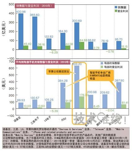 各大廠商的2010年手機(jī)業(yè)務(wù)全年業(yè)績(jī)。諾基亞在按銷售額的排名中位居榜首,不過在按營(yíng)業(yè)利潤(rùn)的排名中,蘋果以將近2倍的差遙遙領(lǐng)先于位居第二的諾基亞。換算到每部手機(jī)上,蘋果的銷售額和營(yíng)業(yè)利潤(rùn)較其他公司高出很多。