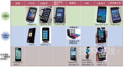 智能手機(jī)的平臺(tái)集中在Android、Windows Phone以及各廠商自主產(chǎn)品這三個(gè)平臺(tái)上。本圖以各廠商2011年發(fā)布的機(jī)型為中心,只標(biāo)示了具有代表性的產(chǎn)品。采用自主平臺(tái)的廠商還自行準(zhǔn)備了應(yīng)用商店等網(wǎng)絡(luò)服務(wù)。