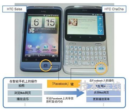 HTC發(fā)布了兩款適合使用SNS“Facebook”的智能手機(jī)。當(dāng)利用攝像頭拍照等預(yù)測(cè)用戶想在Facebook上共享信息時(shí),F(xiàn)acebook鍵會(huì)自動(dòng)閃光。摁下該鍵就會(huì)進(jìn)入上傳信息的畫面。