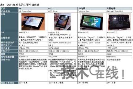 2011年1月,美國(guó)摩托羅拉移動(dòng)公司(Motorola Mobility)發(fā)布了配備Android 3.0的平板終端“XOOM”,以此為開端,2011年2月韓國(guó)LG電子和三星電子分別發(fā)布了“Optimus Pad”和“GALAXY Tab 10.1”。HTC采用Android 2.3投產(chǎn)的首款平板終端“HTC Flyer”計(jì)劃升級(jí)至Android 3.0(表1)。2010年收購(gòu)了美國(guó)Palm的美國(guó)惠普(Hewlett-Packard)也涉足了平板終端市場(chǎng),并于2011年2月發(fā)布了“HP TouchPad”,采用Palm面向智能手機(jī)OS開發(fā)的“webOS”。