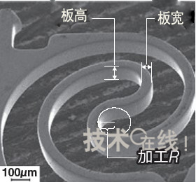 采用電鑄可以形成如圖2的微細形狀。除了可以將部件的板寬降至板厚的1/3以外,還可以將加工R減至0.04mm。同時,每個表面都很光滑。