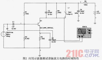 在小信號諧振放大中,電路的輸入信號中除了所需要的信號外還有不需要的信號,它們的頻譜往往不同,所以用選頻的方法,選取需要的頻率分量,抑制不需要的頻率分量。另外,其中有用信號的幅度往往也很小,處理這種信號必須具有選頻和放大雙重功能。小信號諧振放大器電路中晶體管集電極負(fù)載是LC并聯(lián)諧振電路,其阻抗是隨頻率而變化的,回路諧振頻率f0上的阻抗為純電阻并且是最大的,因此諧振放大器在負(fù)載回路的諧振頻率上具有最大的電壓放大增益,稍離開此諧振中心頻率,電壓增益就會迅速減小。在分析中采用仿真軟件來測試諧振放大電路的時域的輸入輸出波形。分析測試電路如圖2所示。