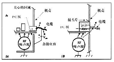 即使工程師采取許多上述所列的預(yù)防措施,來(lái)減小在I/O區(qū)內(nèi)的RF噪聲,還不能保證這些預(yù)防措施能否成功地足夠滿足發(fā)射要求。有些噪聲是傳導(dǎo)干擾,即在內(nèi)部電路板上按共模電流流動(dòng)。這個(gè)干擾源是在底板和電路等之間。于是,這個(gè)RF電流一定通過(guò)最低阻抗(在底板和載信號(hào)線之間)的通路流動(dòng)。如果連接器沒呈現(xiàn)足夠低的阻抗(與底板的搭接處),這RF電流經(jīng)雜散電容流動(dòng)。當(dāng)這RF電流流過(guò)電纜時(shí),不可避免地產(chǎn)生發(fā)射(圖1A)。