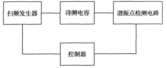 同時(shí)諧振發(fā)生時(shí)整個(gè)LC 回路表現(xiàn)出的阻抗為純阻性, 即感抗和容抗之和為零。利用這個(gè)原理, 使用一個(gè)掃頻信號(hào)激勵(lì)待測(cè)電容, 測(cè)量出諧振頻率, 再結(jié)合式(1) 即可測(cè)出寄生電感的大小 。根據(jù)該原理, 設(shè)計(jì)1 個(gè)掃頻發(fā)生器產(chǎn)生掃頻信號(hào)激勵(lì)待測(cè)電容, 然后找出諧振點(diǎn), 讀出諧振頻率即可求出電容的寄生電感。其結(jié)構(gòu)如圖3 所示。