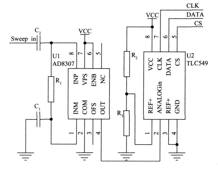 由于該檢測(cè)電路只是檢測(cè)出諧振點(diǎn),即圖2 中的最低點(diǎn), 只是一個(gè)比較關(guān)系, 并未對(duì)檢測(cè)到的最低點(diǎn)的電平精度有很高要求, 因此對(duì)采樣電路的精度要求不高,又因?yàn)閷?duì)數(shù)檢波器的輸出是直流信號(hào), 所以常見(jiàn)的大多數(shù)低速AD 轉(zhuǎn)換器都可以滿足要求。這里采用串行8 位的AD 轉(zhuǎn)換器TLC549。TL549 采用三線制串行控制方法, 很方便與單片機(jī)控制器接口。該檢測(cè)電路的原理圖如圖5 所示。