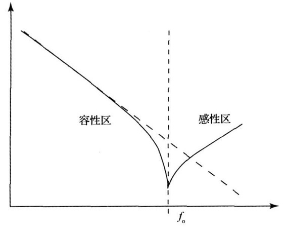 其中C 為實(shí)際電容本身的標(biāo)稱電容, L 是其寄生電感, Rp是其并聯(lián)等效電阻, Rs 是其串聯(lián)等效電阻。寄生電阻會(huì)對(duì)經(jīng)過(guò)電容的信號(hào)造成衰減, 但不會(huì)影響電容本身的頻率特性。寄生電感會(huì)與電容構(gòu)成串聯(lián)諧振回路, 會(huì)使實(shí)際的電容在某個(gè)頻率上發(fā)生諧振, 這種現(xiàn)象稱為電容的自諧振 。實(shí)際電容的阻抗和頻率特性曲線如圖2 所示。
