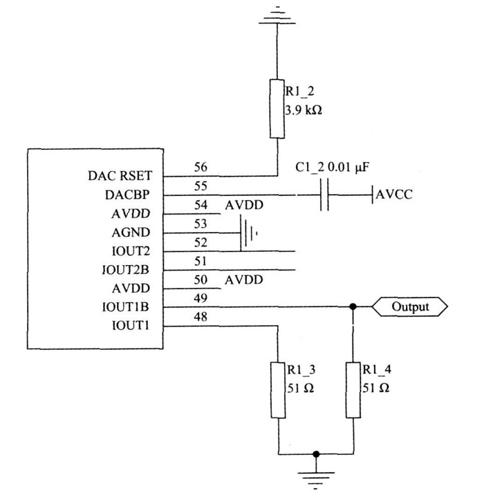 掃頻發(fā)生器在本系統(tǒng)中產(chǎn)生寬頻帶掃頻信號(hào)以激勵(lì)待測(cè)電容, 當(dāng)電容較大時(shí),以常見(jiàn)的電解電容為例,假設(shè)電容為1 000  F, 其寄生電感為100 nH, 則按照式(1)可計(jì)算出其自諧振頻率為15. 9 kHz, 諧振頻率較低;另以瓷片電容為例, 假設(shè)其電容值為10 pF, 寄生電感約為10 nH, 則其自諧振頻率為500 MHz 這兩個(gè)信號(hào)頻率相差了4 個(gè)數(shù)量級(jí), 這就需要1 個(gè)寬帶的信號(hào)發(fā)生器, 這也是本部分的設(shè)計(jì)難點(diǎn)所在。若采用傳統(tǒng)的模擬信號(hào)發(fā)生的方法, 為了實(shí)現(xiàn)信號(hào)頻率的可調(diào), 一般會(huì)采用變?nèi)荻O管構(gòu)成的LC 振蕩器, 然而在信號(hào)頻率較低時(shí), 所需要的變?nèi)荻O管的電容量會(huì)很大,而傳統(tǒng)的變?nèi)荻O管電容值一般只是幾個(gè)pF 至幾百pF ,很難滿足低頻振蕩要求。為了簡(jiǎn)化掃頻電路, 以及實(shí)現(xiàn)數(shù)字化控制, 這里采用DDS 技術(shù)產(chǎn)生寬帶信號(hào)。DDS 采用的是DA 轉(zhuǎn)換器的原理, 通過(guò)計(jì)數(shù)器累加實(shí)現(xiàn)的連續(xù)波形輸出 , 而DDS 芯片外圍電路簡(jiǎn)單, 通過(guò)寫(xiě)它的寄存器便可實(shí)現(xiàn)信號(hào)頻率的調(diào)節(jié), 同時(shí)產(chǎn)生的信號(hào)頻率分辨率高,一般可以達(dá)到0. 01 Hz 級(jí)別, 信號(hào)頻率的跨度大, 可以實(shí)現(xiàn)從幾Hz 到幾百M(fèi)Hz 的連續(xù)信號(hào), 非常適合做掃頻發(fā)生器。這里采用了AD9854 這款DDS 芯片, 它在300 MHz 時(shí)鐘驅(qū)動(dòng)下, 按照乃奎斯特采樣定律可以產(chǎn)生最高150 MHz 的信號(hào),為了得到信號(hào)較好的頻率則一般只得到最高100 MHz 的信號(hào)。若要得到高于100 MHz 的信號(hào), 則可采用其高次諧波得到。基于AD9854 的信號(hào)發(fā)生電路如圖4 所示。限于篇幅,僅畫(huà)出了關(guān)鍵的輸出部分和電流設(shè)置部分。AD9854 內(nèi)置4~ 12 倍頻的時(shí)鐘倍頻器, 因此可以外加1 個(gè)較低頻率的時(shí)鐘,通過(guò)倍頻器倍頻至300 MHz, 這樣可以極大的降低高速片外時(shí)鐘對(duì)系統(tǒng)造成的電磁兼容性問(wèn)題。AD9854 內(nèi)部有1個(gè)頻率控制字寄存器,通過(guò)寫(xiě)該寄存器的值便可以改變輸出信號(hào)的頻率, 非常適合數(shù)字控制。同時(shí)由于時(shí)鐘采用的時(shí)晶體振蕩器,因此輸出頻率的穩(wěn)定度和分辨率都非常高, 一般為10- 6數(shù)量級(jí)。