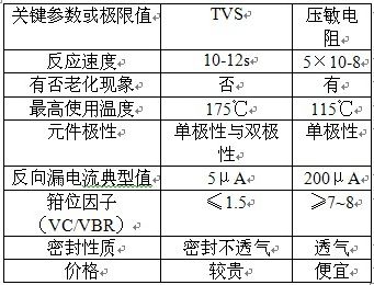 目前,國(guó)內(nèi)不少需進(jìn)行浪涌保護(hù)的設(shè)備上使用的是壓敏電阻。壓敏電阻是一種金屬化物變阻器。TVS比壓敏電阻的特性優(yōu)越得多,具體特性參數(shù)的比較如下表所示。