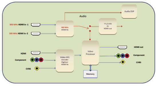 以4K系統(tǒng)為例,圖1所示的是一個典型的支持4K的系統(tǒng)。支持300MHz的接口由HDMI來實(shí)現(xiàn)。系統(tǒng)接收了4K的信號后,可以以兩種方式處理: