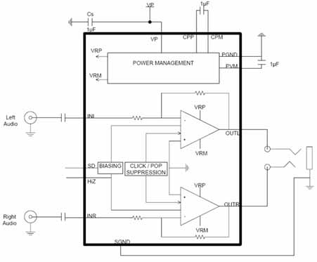圖4:NCP2815“長(zhǎng)播放時(shí)間”立體聲耳機(jī)放大器框圖。
