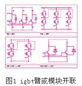 隨著市場對兆瓦級大功率變流器的需求激增,目前igbt并聯方案已成為一種趨勢。因為igbt并聯能夠提供更高的電流密度、均勻的熱分布、靈活布局以及較高的性價比(這取決于器件及類型)。通過將小功率igbt模塊(包括分立式igbt)、大功率igbt模塊進行并聯組合,可獲得不同額定電流的等效模塊,而且實現并聯的連接方式也靈活多樣。以高壓變頻器中廣泛采用的h橋拓撲結構功率單元為例,其并聯實現可以用不同電路結構的igbt模塊,如半橋“ff”、單個“fz”、四單元“f4”和六單元“fs”,如圖1所示。并聯可降低模塊熱集中,使其獲得更加均勻的溫度梯度分布,較低的平均散熱器溫度,這有益于提高熱循環周次。因此,igbt并聯是大功率設計應用的最佳解決方案之一。