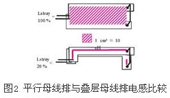 由鄰近效應原理可知,某一導體的高頻電流在鄰近的導體層會形成輻射干擾電流。對于雙層銅排,當電流源路徑與地平面互相疊層并使間距滿足絕緣層厚度遠小于母排寬度時,高頻電流將主要分布在兩塊銅排相臨近的兩個內部平面上,部分高頻磁場可以相互抵消,相當于等效減小了回路電感。疊層母線排與平行母線排電感大小比較如圖2所示。