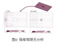 圖7為實際優化后使用的h橋母線排結構,在考慮到電流路徑和電容端子方向及其他優化方式后,使用有限元分析軟件ansoft對其表面電流分布進行了仿真。仿真結果如圖8所示。由圖8中可以看出,除母線排開孔處由于渦流效應導致的電流分布不均勻以外,整個母線排的電流分布比較均勻,由此造成的雜散電感經過有限元軟件直接提取結果為21nh,可以滿足工業要求。