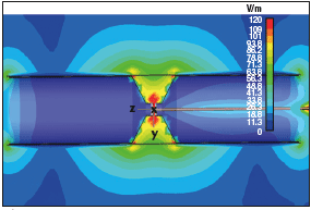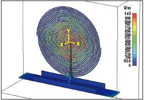 螺旋天線很早以前就開始用于軍事應(yīng)用中的測向和通常的威脅識別。圖1給出了一種典型的2到18GHz腔基螺旋天線,圖2給出了使用這種天線進(jìn)行的一次電磁仿真,顯示了此構(gòu)造不同部分上的場強。在這些應(yīng)用中,通常要求天線的幅度和相位每一個都是統(tǒng)一樣式。還要求主瓣應(yīng)該擁有平滑的曲線,沒有任何拐點,即為單調(diào)的。這種天線典型輻射圖樣如圖3所示。通常這些應(yīng)用中更重要的是控制波束形狀并使各個天線元的性能匹配,而不是使天線增益最大化。對于許多商業(yè)通信系統(tǒng),更重要的是給某個區(qū)域有效地填充信號而不是產(chǎn)生非常精確的波束形狀。