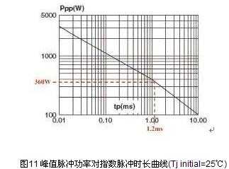 我們要解決的問(wèn)題是根據(jù)所要消除的電涌來(lái)確定保護(hù)元器件的參數(shù)。以圖8中的ISO7637-2 脈沖2為例,不難看出,抑制器上的鉗制電壓大約是30V,峰值脈沖電流 (Ip)大約是12A,在Ip/2點(diǎn)測(cè)得電流脈沖時(shí)長(zhǎng)(tp)是4μs。因此,可判定TVS必須消耗360W的最大脈沖功率(Pp) 。所有這些Pp、Ip和tp值是有用的,因?yàn)樗鼈兛梢詭椭容^TVS數(shù)據(jù)表中的峰值脈沖功率對(duì)指數(shù)脈沖時(shí)長(zhǎng)的曲線,以確保TVS在應(yīng)用的限制范圍內(nèi)。