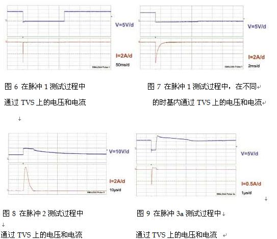 當(dāng)承受圖1中的1、2、3a和3b的脈沖時(shí),該保護(hù)電路的特性如圖6、圖7、圖8、圖9和圖10所示。
