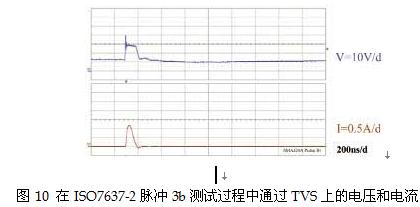 以SMAJ24A為例,從產(chǎn)品數(shù)據(jù)表摘取這些參數(shù)與圖11的曲線進(jìn)行比較,發(fā)現(xiàn)SMAJ24A符合ISO7637-2脈沖2測(cè)試的要求,可承受長(zhǎng)達(dá)1.2ms的360 W指數(shù)脈沖,這個(gè)數(shù)值遠(yuǎn)遠(yuǎn)高于ISO7637-2脈沖2電涌強(qiáng)制的4μs時(shí)長(zhǎng)。