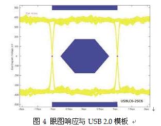 還有一種方法可以檢查這個(gè)軌對(duì)軌保護(hù)元器件對(duì)USB協(xié)議正常工作模式的影響,就是通過(guò)圖4的眼圖響應(yīng)來(lái)分析信號(hào)數(shù)據(jù)位的完整性。