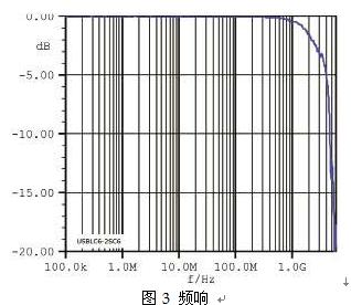 圖3中截止頻率大約為5GHz,遠(yuǎn)離USB 480Mb/s收發(fā)器的正常工作頻率,因此,USB收發(fā)器可以安全工作。