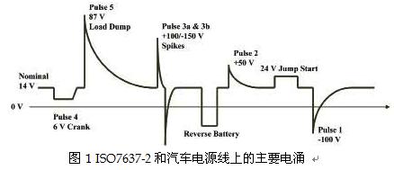 圖1簡(jiǎn)要描述了ISO7637-2和汽車(chē)電源線上的主要電涌。