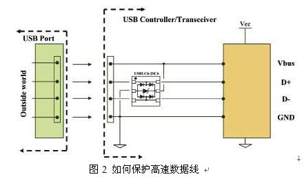 這個(gè)辦法的實(shí)質(zhì)是在USB接口附近連接一個(gè)保護(hù)元器件。它由幾支采用軌對(duì)軌結(jié)構(gòu)的二極管組成,本身具有低電容的特性。內(nèi)部鉗位器件為兩條數(shù)據(jù)線提供±25kV ESD (ISO10605)保護(hù)功能,以及為Vbus電源線提供保護(hù)功能。