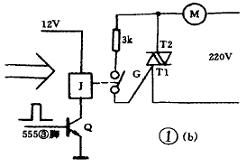 正確的方式見圖1b。可控硅與抽水電機組成抽水控制開關,SCR的觸發由T2與G間接入電阻控制。當水位降低時,控制觸點開路,555第3腳輸出高電平(此電路部分省略),使Q導通,繼電器J吸合,SCR觸發導通,電機開始運轉。當水位達到時, 觸點經水接通,555第3腳輸出低電平,Q截止,SCR在交流電過零時截止,抽水停止。