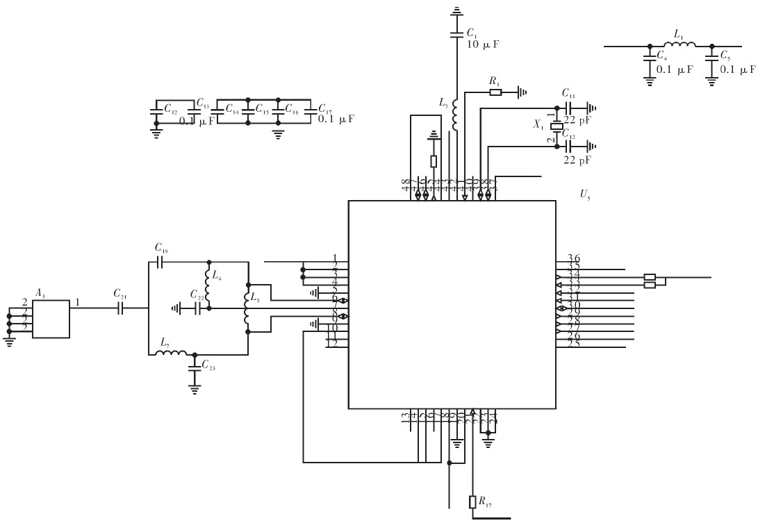 圖3中無線射頻模塊的外圍電路采用CC2420手冊提供的典型應用電路的器件數值,這樣保證了芯片能工作在正常狀態。另外為達到最優性能,必須使用電源去耦,去耦電容和電源過濾的設置和大小對于在應用中獲得最優性能起著關鍵作用,TI提供一個緊湊的參考設計,必須嚴格按照該設計進行。同時增加數字、模擬電源采用電容濾波。CC2420需要一個16 MHz的參考時鐘用于傳輸速率為250 kbit·s-1的數據收發,參考時鐘可以來自外部時鐘源,也可以由內部晶體振蕩器產生,這里采用內部晶體振蕩器產生的方式。天線阻抗匹配至關重要,為獲得較好的發射功率,在原有基礎上對部分電容、電感進行了適當的調整。CC2420與微控制器的通信通過4線SPI總線實現(SI、SO、SCLK、CSn),通過控制FIFO和FIFOP管腳接口狀態可以使芯片工作在發射或接收模式,另外CCA用于空閑信道評估,SFD用于控制時鐘或定時信息的輸入。