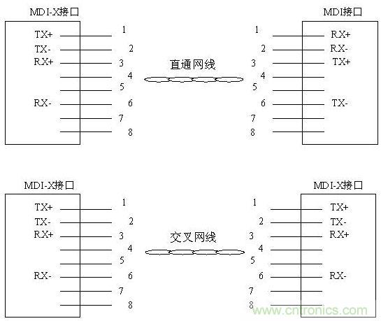 從以上分析可看出,網線連接兩個接口的目的是使兩端TX與RX對接起來,因此,當MDI-X接口與MDI接口相連時需使用直通網線,而MDI接口與MDI接口相連或MDI-X接口與MDI-X接口相連時需使用交叉網線。