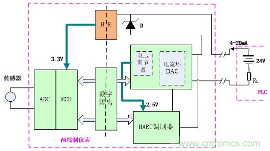 圖一的電路中,傳感器的信號經(jīng)過ADC轉(zhuǎn)換成數(shù)字信號,再經(jīng)MCU發(fā)送給電流環(huán)DAC及HART調(diào)制器,形成4-20mA的信號輸出,電流環(huán)DAC從PLC輸出的4-20mA總線上取電,經(jīng)內(nèi)置的電壓調(diào)節(jié)器輸出3.3V及2.5V,給MCU及HART調(diào)制器提供少量的電源。