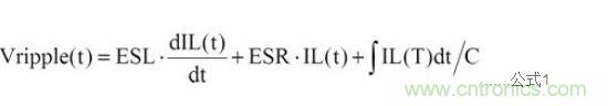 一般而言,在穩態(Steady State)及負載固定時,輸出電容的紋波電壓主要是由電感的紋波電流造成,可先計算出電感的紋波電流,再利用歐姆定律,電感微分公式及電容電荷儲存公式,分別計算出ESR、ESL及Capacitance的紋波電壓。再將此三種紋波加總起來,便可得輸出電容的紋波電壓,如公式1所示:
