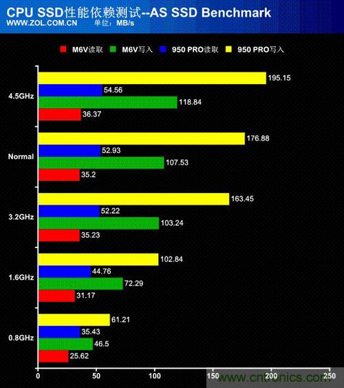 接下來的SSD寫入測試,CPU 1.6GHz頻率下,平均讀取速度為4.36MB/s,頻率提升至4.5GHz后平均讀取速率提升至11.2MB/s,性能提升幅度高達157%,相對應的CPU頻率之間的差異為181%,性能提升幅度與頻率差異有一定差異。