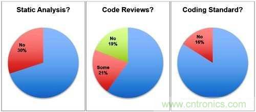 接著讓我們繼續更深入一點探討:要符合產業安全性標準,可能耗費大量成本與時間,那么要實現一個優良設計的其他最佳實作呢?例如在軟體設計上使用編碼標準、程式碼審查以及統計分析?在這個技術領域從事攸關安全裝置設計的工程師受訪者們的回應更令人擔心了,請看下圖的統計: