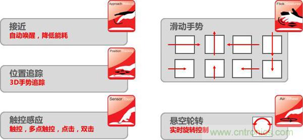 其中比較有代表性的,要數Microchip公司的GestIC技術。它基于電場感應的原理,在電子設備周邊的空間中形成一個電場。當手部在空間中運動時會使電場發生畸變,布設在電場中的電極接收器會感應到這種變化,并通過專門的控制芯片進行信號處理,對手勢進行識別和運動追蹤,并將數據傳遞給電子設備做出響應。Microchip代理商世健公司產品經理介紹,與采用攝像頭的光學3D手勢識別技術相比,GestIC技術最大的優勢在于功耗極低,能耗節省多達90%,同時能避免環境光等外部因素的干擾,雖然是一個近場識別技術,但其在家庭自動化、家電控制、音響系統、電腦及配件、汽車電子等方面,會有諸多應用場景。