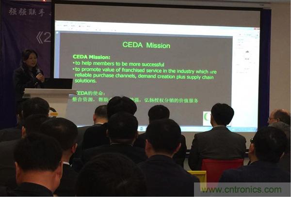 圖1:《2015中國電子授權分銷商名錄》發布會暨行業領袖峰會,CEDA常務理事Amy Wang介紹CEDA的使命