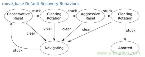 如果世界是完美的,那按照規劃的地圖行進到目的地就完事了。然而基于行為方法就是為了處理各種意外而生的。當機器人遇到障礙物或是被卡住的時候,內嵌的基于行為的系統就開始發揮作用。會根據情況,在“行為庫”recovery_behaviors中調用某一預先設定的“行為”來擺脫困境。